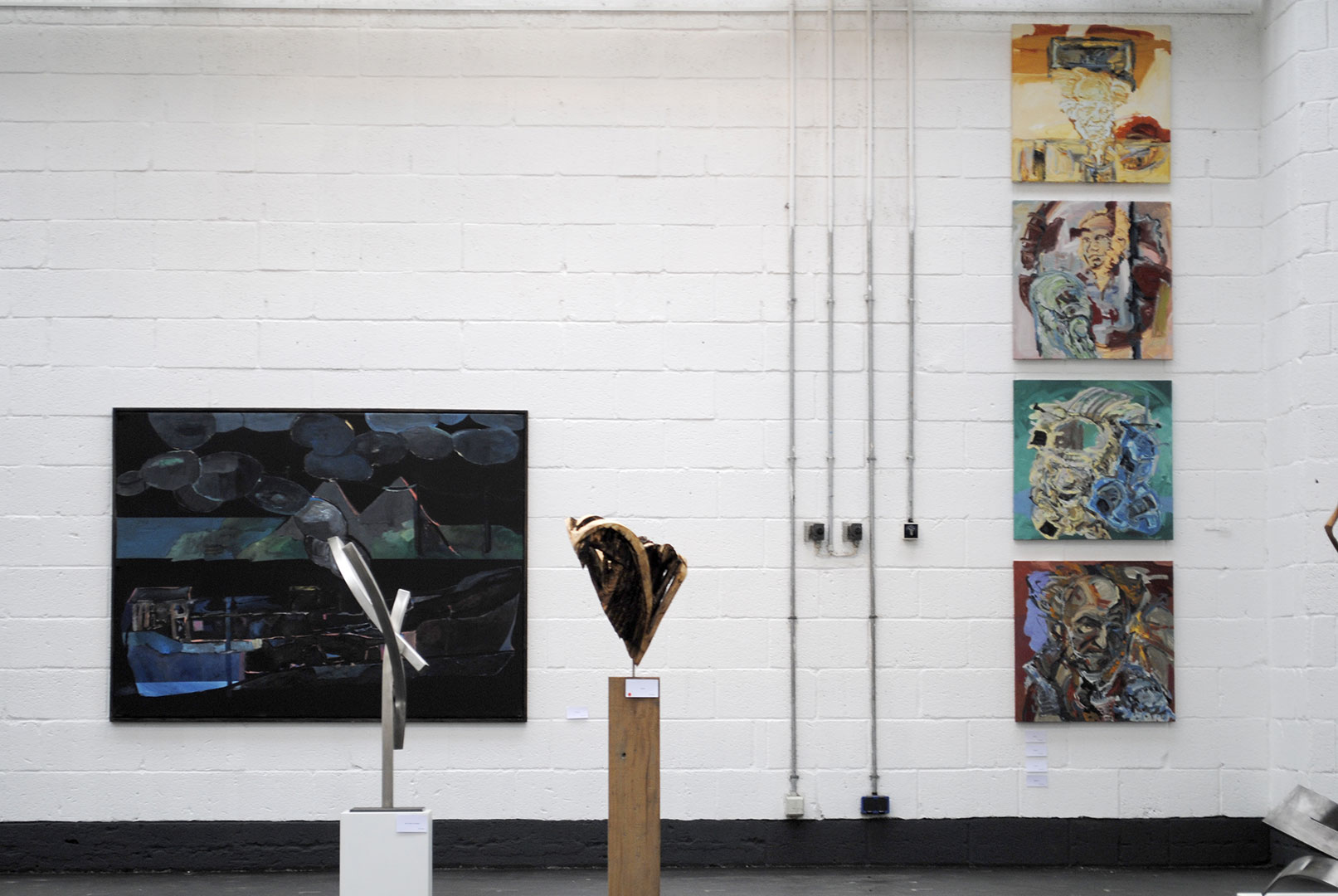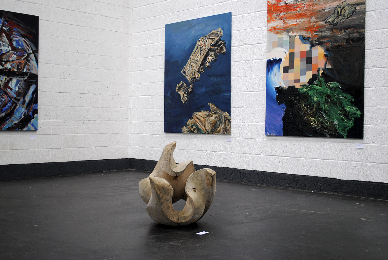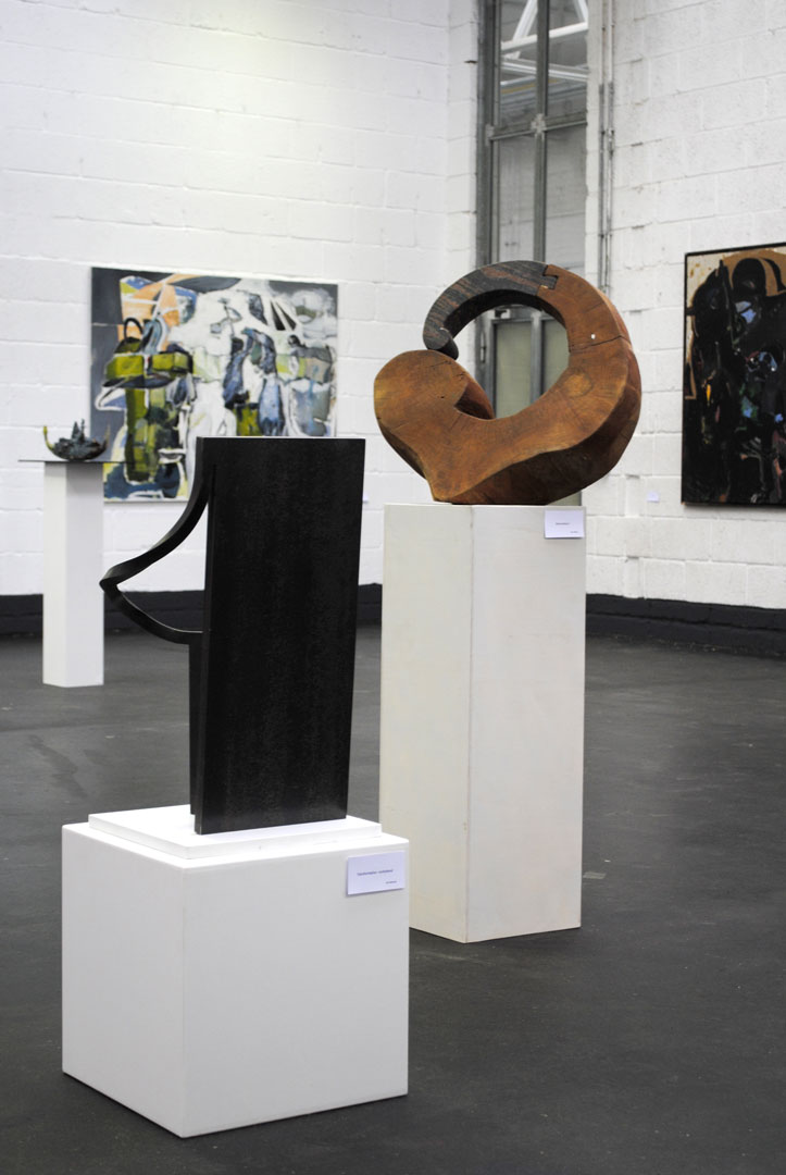 Platz für die Interaktion zwischen Skulpturen und Bildern – das erzeugt Spannung. Die Linie, die sich zwischen Struktur und Farbe auftut, ist Grenze und Verbindung zugleich; die Leere wird zum gestaltenden Faktor, sie sorgt für ein ausgewogenes Gesamtambiente.